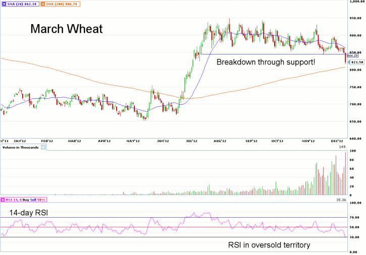 Looking at the daily chart for March Wheat, we notice prices trading below the lows of the recent price consolidation, which appears to have triggered some sell-stops below previous support levels. Prices are now moving towards long-term support at the 200-day moving average, which is currently near the 807.00 price area.