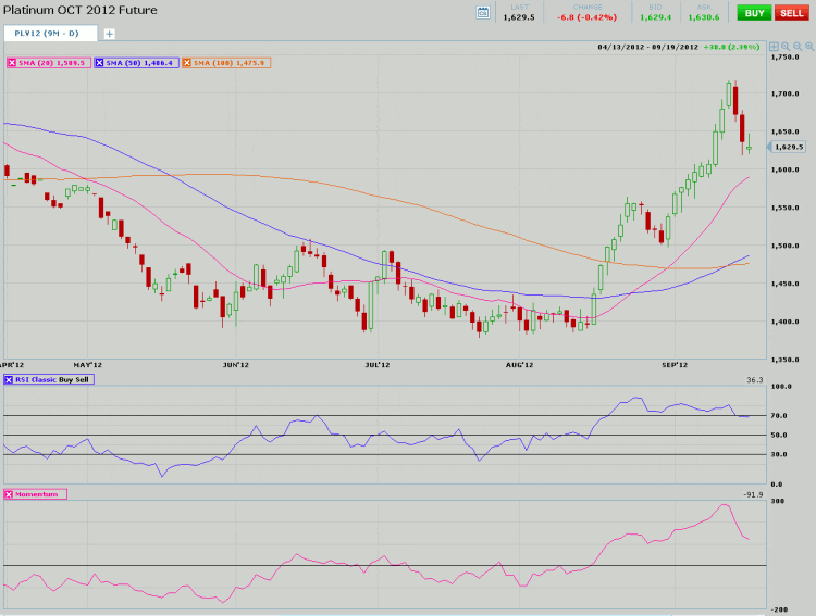 Platinum futures tumbled for the second consecutive session, after workers at Lonmin’s South African mine reached an agreement. The mine accounts for 10% of global Platinum production. QE3 and worker turmoil have been major reasons for the sharp rise in Platinum prices. South Africa, in particular, has been plagued with labor issues akin to South American Copper mines.Platinum holdings by investors have risen to record levels, suggesting the market may be a bit overbought, fundamentally speaking. Given its industrial nature, Platinum could be seen as more sensitive to economic data than other precious nature.