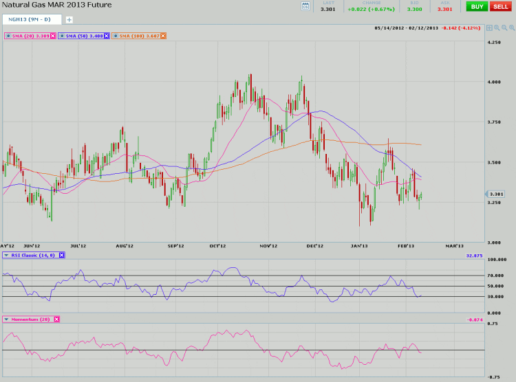 Turning to the chart, we see the March Natural Gas contract bouncing off support at the 3.20 level. The 3.20 mark can be seen as an important support level,and a failure to hold here could potentially result in significant price declines.