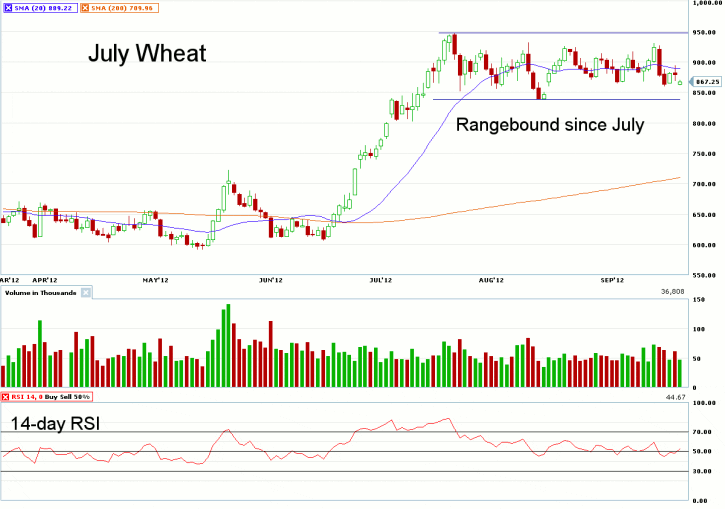 Many bullish and bearish Wheat traders seem to have reached a stalemate, with price activity turning choppy and range bound. Since the middle of July, lead-month December Wheat has traded in a narrow $1.00 price band, as Wheat price movement mostly followed that of Corn as some traders looked for increased demand for wheat, as animal feed due to high Corn prices. However, now that Wheat prices are over $1 per bushel higher than Corn, some analysts are looking for less Wheat to be used as feed. U.S.