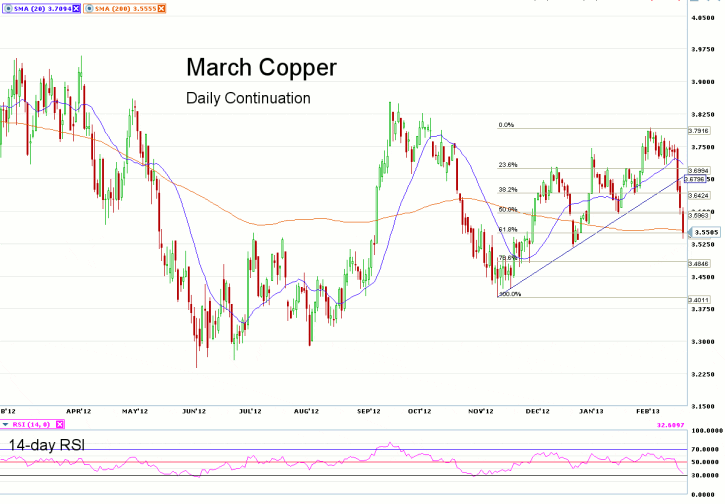 Looking at the daily continuation chart for Copper futures, we notice prices falling sharply through the uptrend-line drawn from the November 2012 lows. Prices are now testing the 200-day moving average, which is holding near the 3.5555 price level.