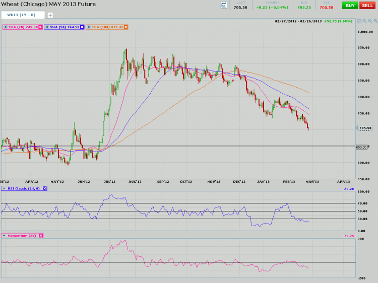 Turning to the chart, we see the May Wheat contract continuing to break down after failing to break through the 800 mark on the upside. The result of the two failed attempts to cross this level was a small M-top in the daily chart.