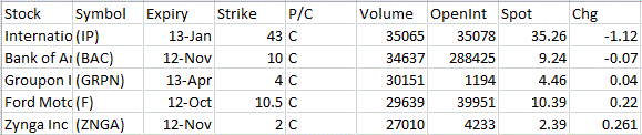 Most Active Equity Options & Strikes – IP, BAC, GRPN, F, ZNGA by The Options Insider | Oct 25, 2012 | Unusual Activity